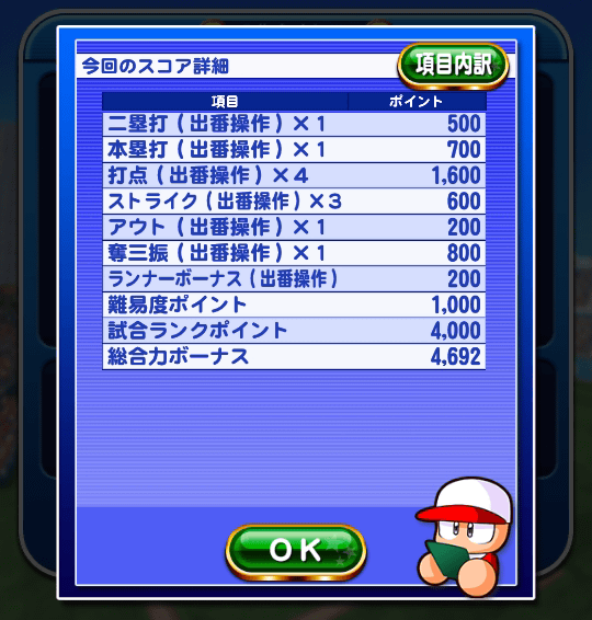 | 二塁打 | 出番操作で打者がヒットによって二塁まで出塁した場合につく評価ポイント |